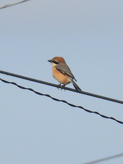 目の前の電線にとまるモズ。里山を代表委する野鳥です。