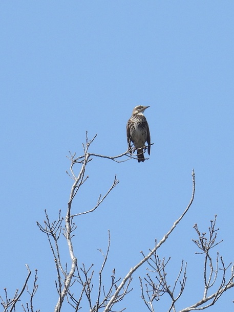 枝先にとまるのはツグミ。
