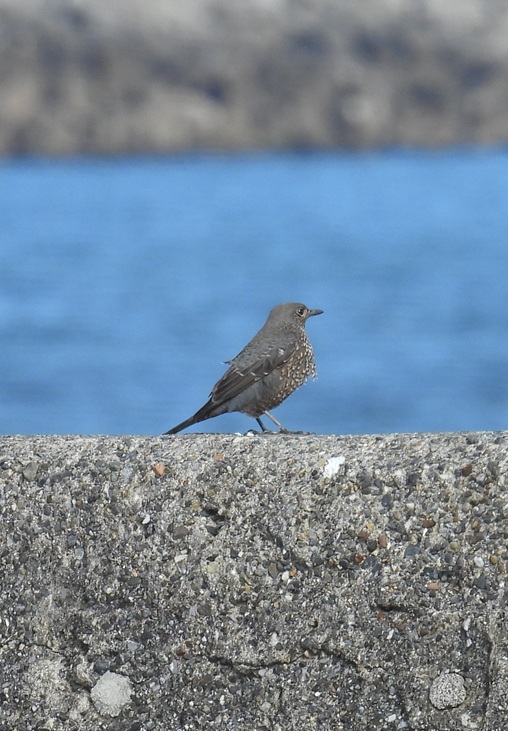 堤防にいたのはイソヒヨドリの雌。褐色で地味な羽色ですが、鱗状の模様が特徴的です。