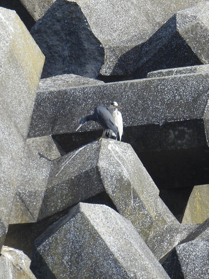 テトラポッドにはクロサギがもう1羽。あれ?後ろにいるのはアオサギです。