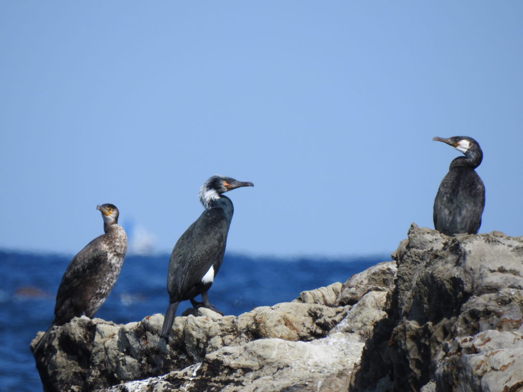 南房総では冬期にのみ見られる海鳥です。岩礁で群れでいるところをよく目にします。魚が主食で、潜水して高速で泳ぎ捕らえます。最高水深40mまで潜れる、優れたスイマー。岩場で羽を広げ、濡れた翼を乾かす姿は特徴的。近縁種のカワウに酷似しますが、カワウが内陸の水域でも見られるのに対して、ウミウは通常海でしか見られません。